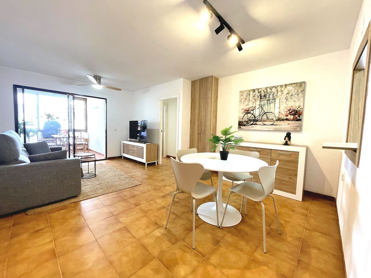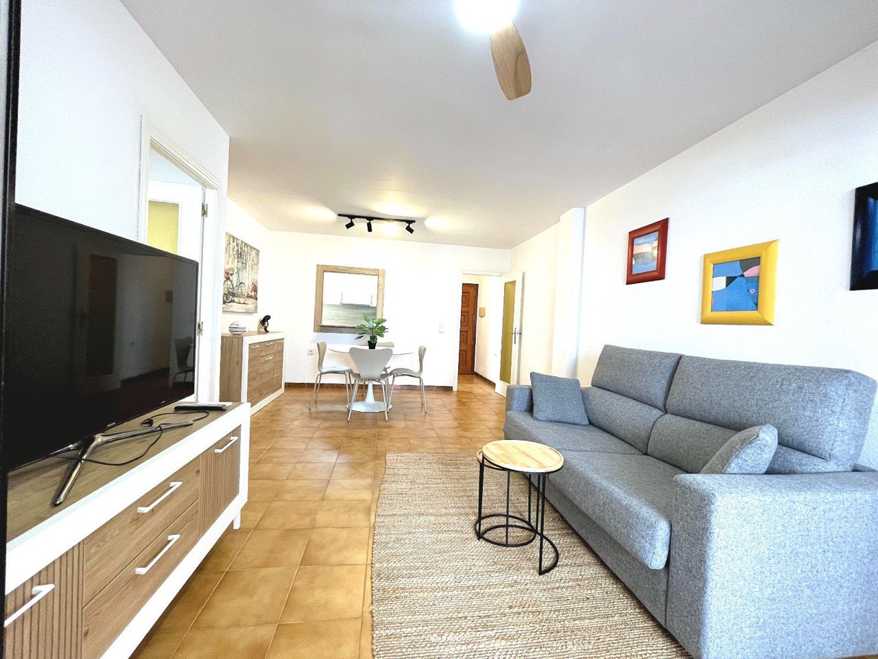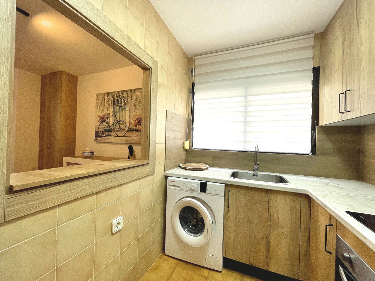 Al ingresar a esta vivienda renovada, te recibirá un acogedor salón/comedor, ideal para relajarte y disfrutar de momentos inolvidables junto al mar. El ventilador de techo aporta frescura en los días cálidos de verano, mientras que la cocina independiente está equipada de manera funcional para preparar tus platos favoritos.