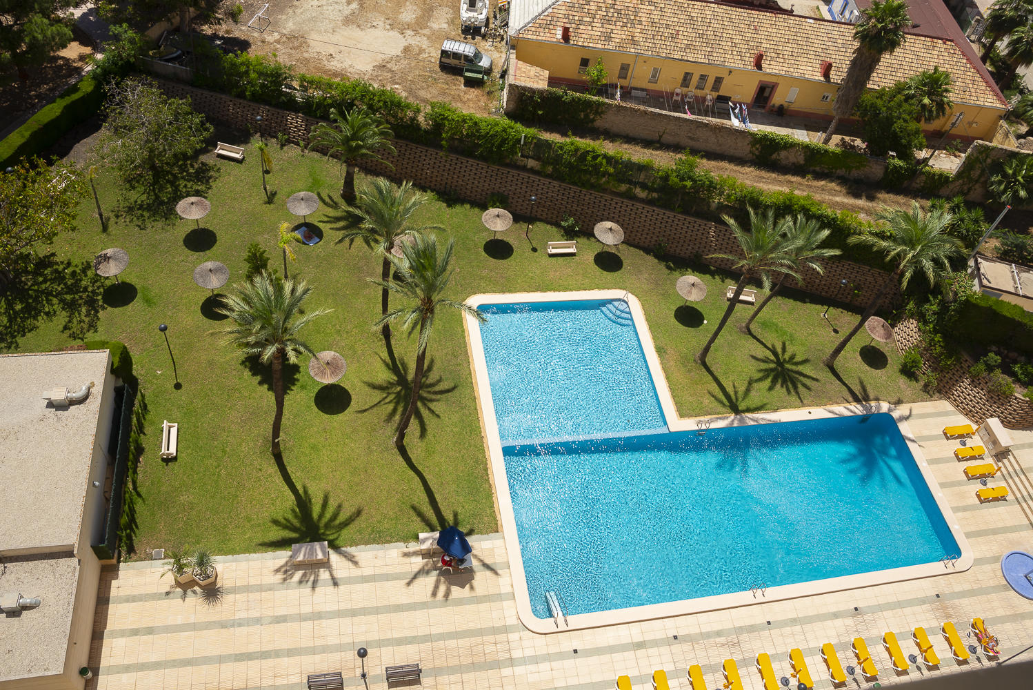 En el territorio del edificio hay una enorme piscina rodeada de césped.