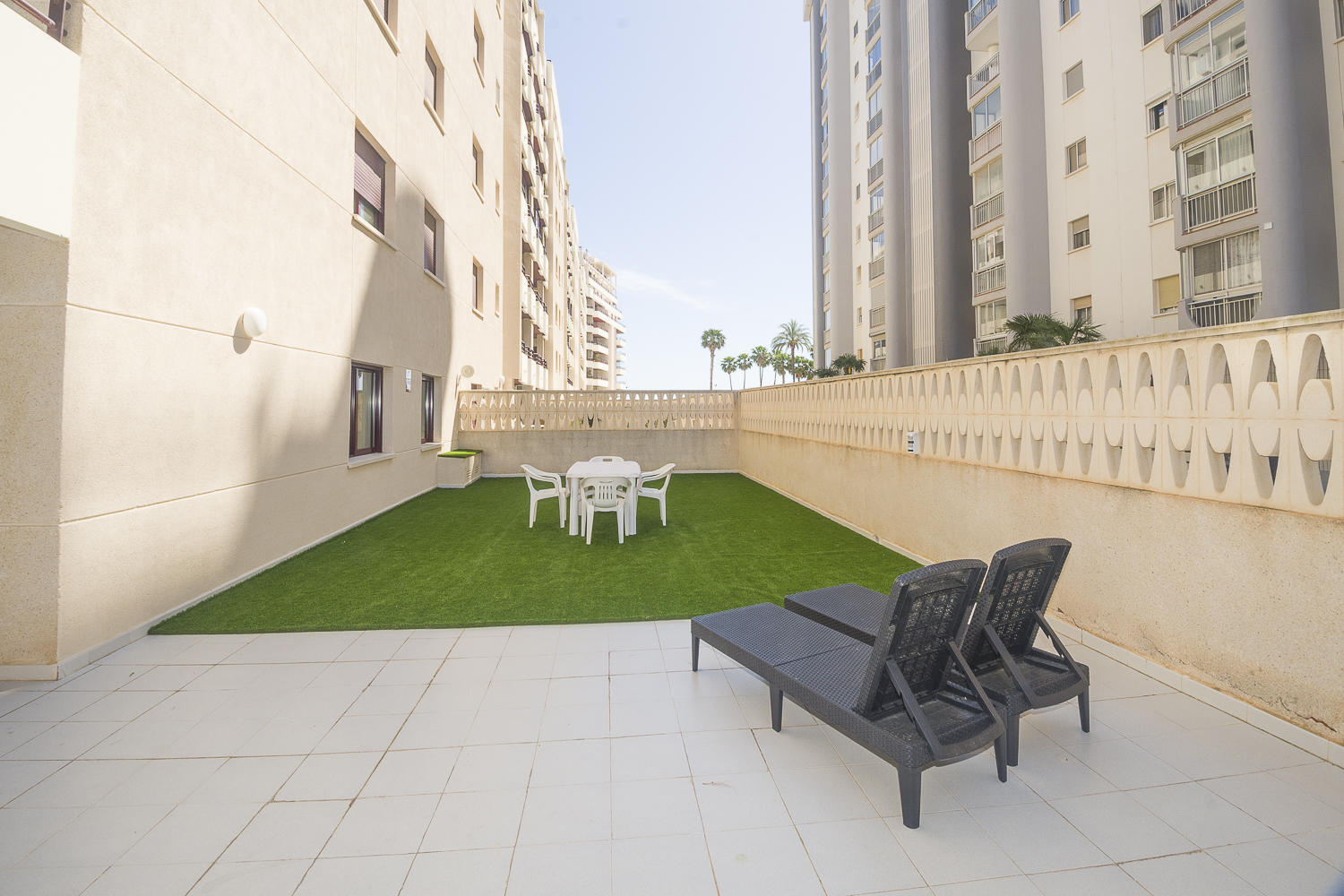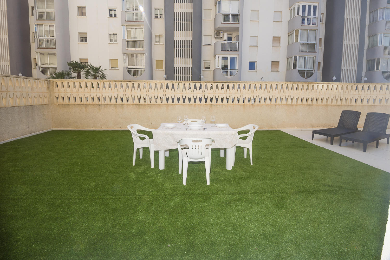 Hay una enorme terraza en la planta baja con mesa y 4 sillas, suelo de césped artificial, tumbonas y luz directa.